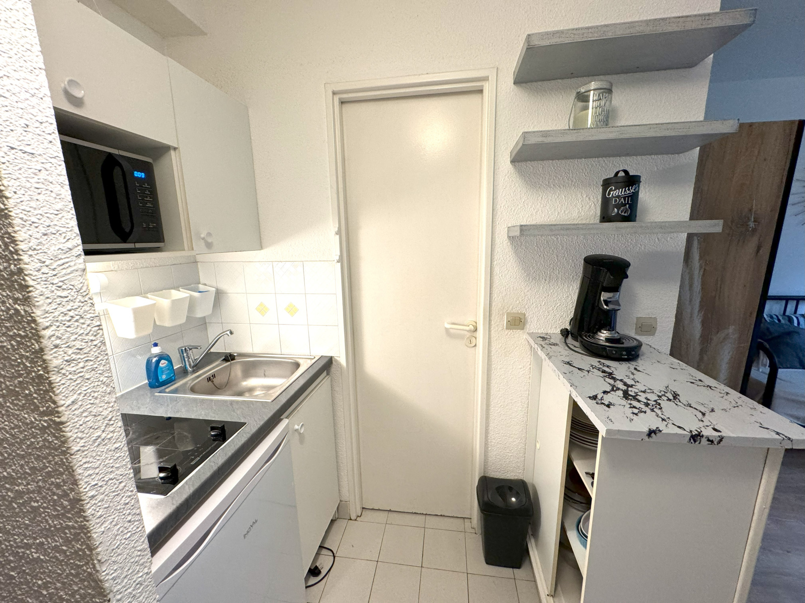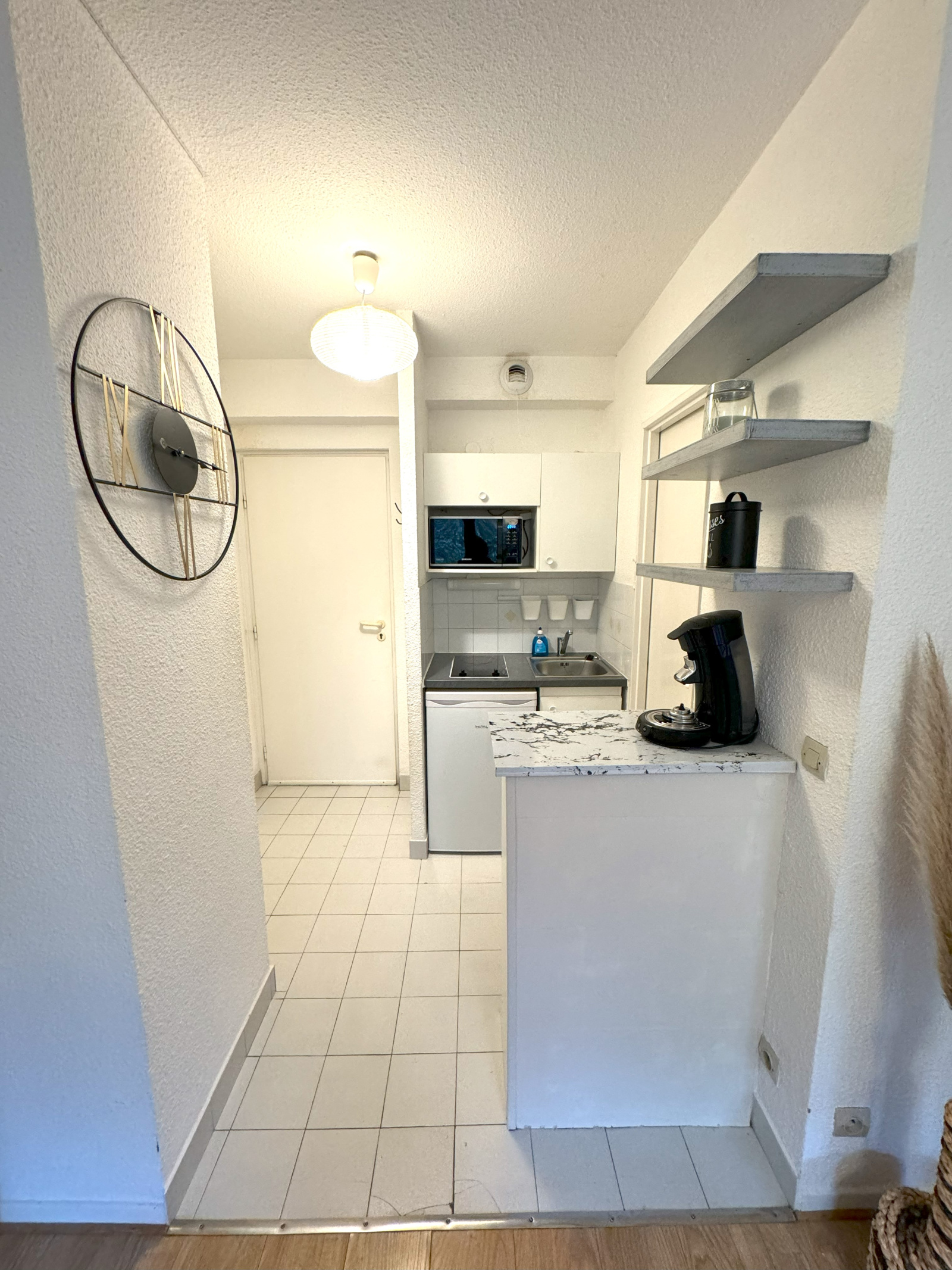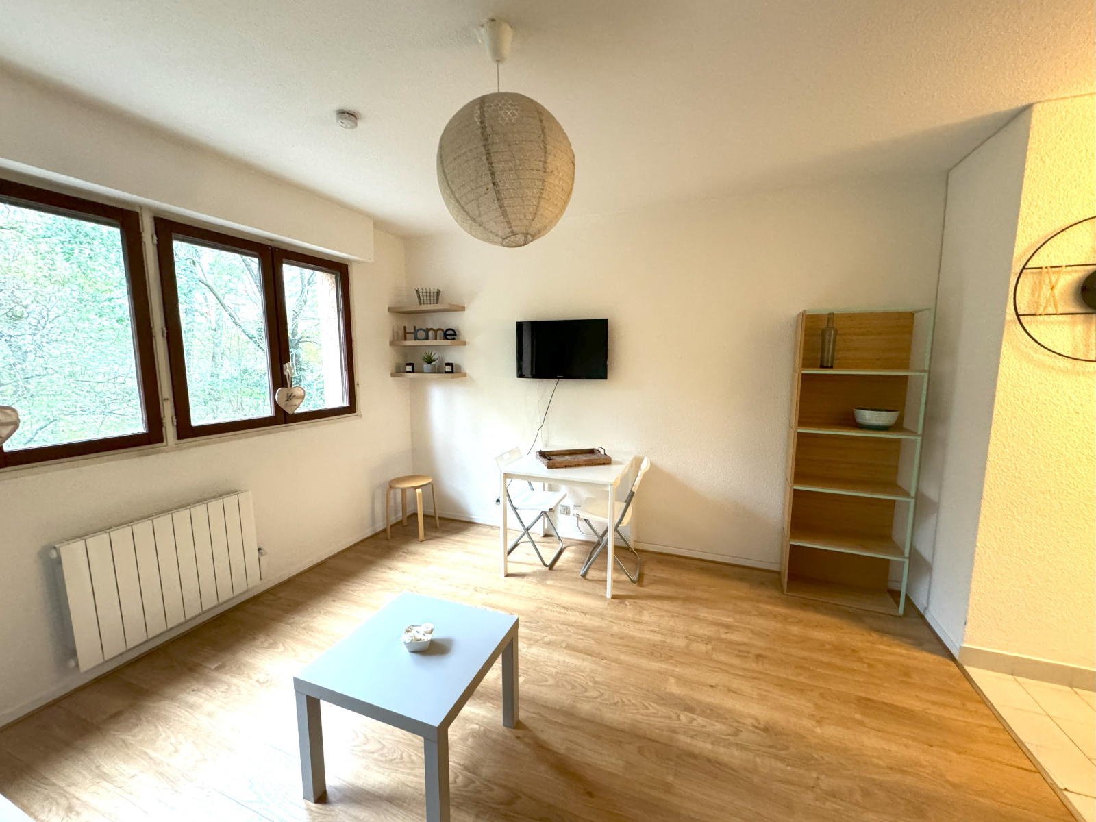 A louer joli T1 meublé au 1er étage d'une petite résidence fermée, composé d'un séjour donnant sur la forêt, salle de bains, wc.Cuisine avec plaques électriques, hotte et rangements. Laverie automatique à 100 mètres.