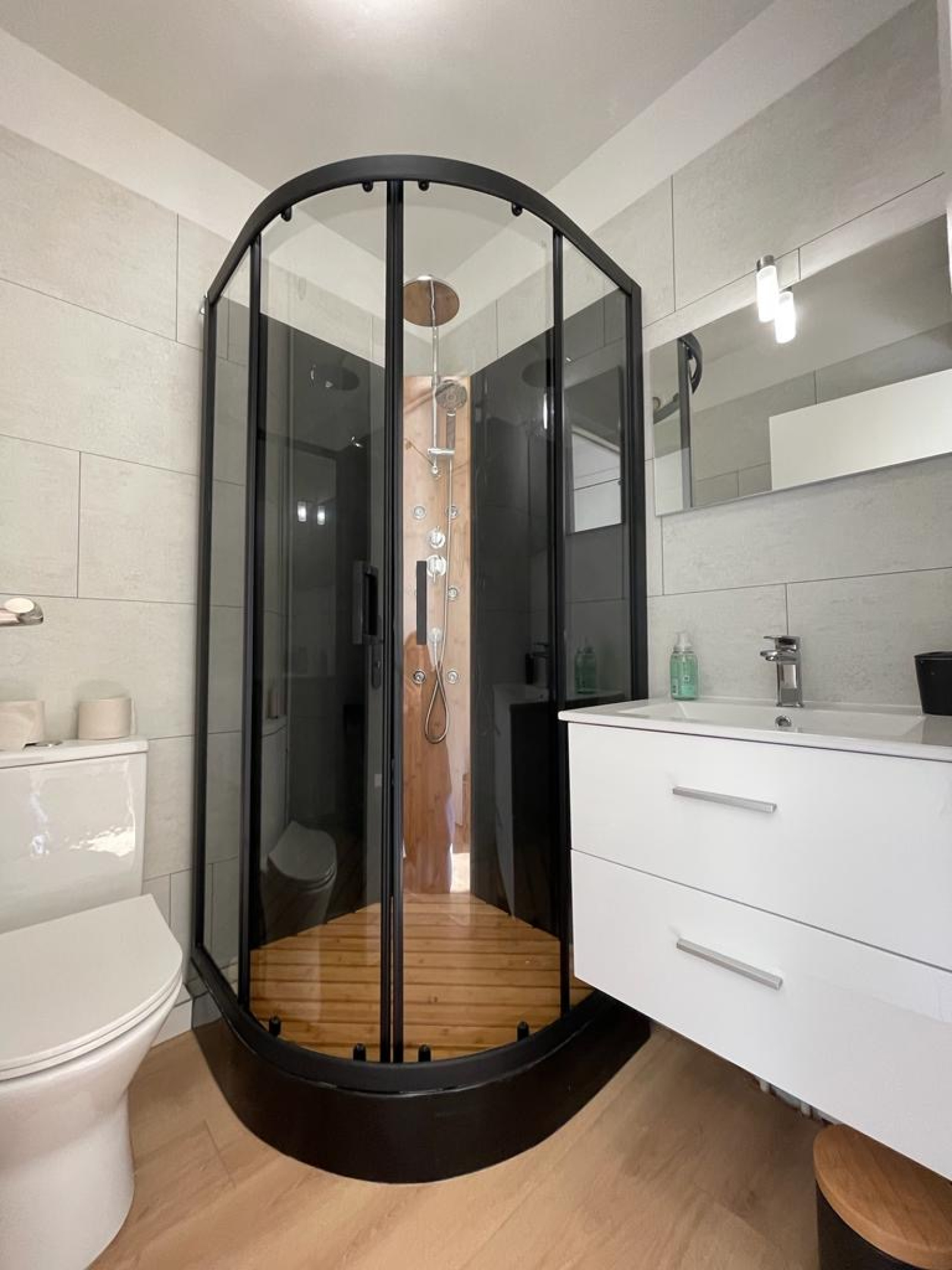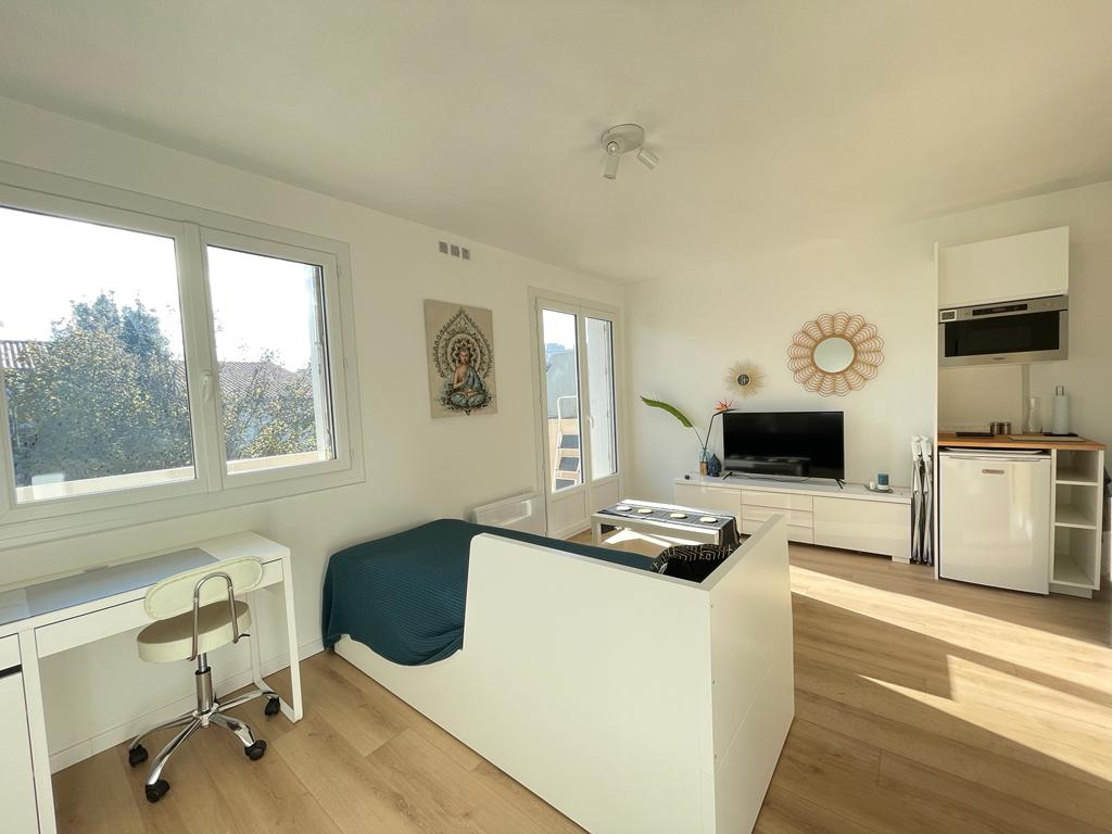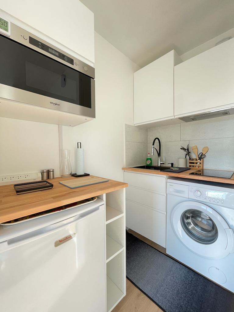 Il dispose d'une jolie cuisine neuve entièrement équipée et meublée (plaque de cuisson, machine à laver, hotte, frigo ...) un séjour avec lit gigogne donnant sur un balcon, lumineux, calme et une salle d'eau avec douche et WC.