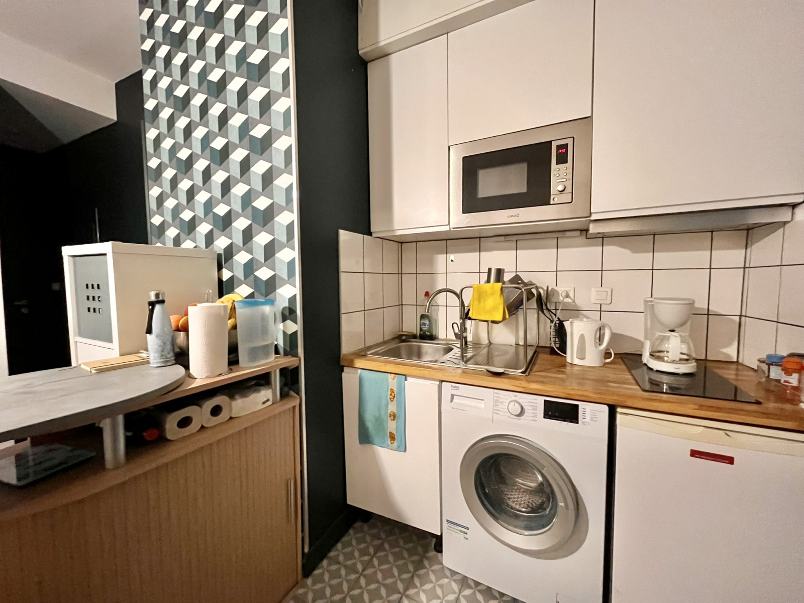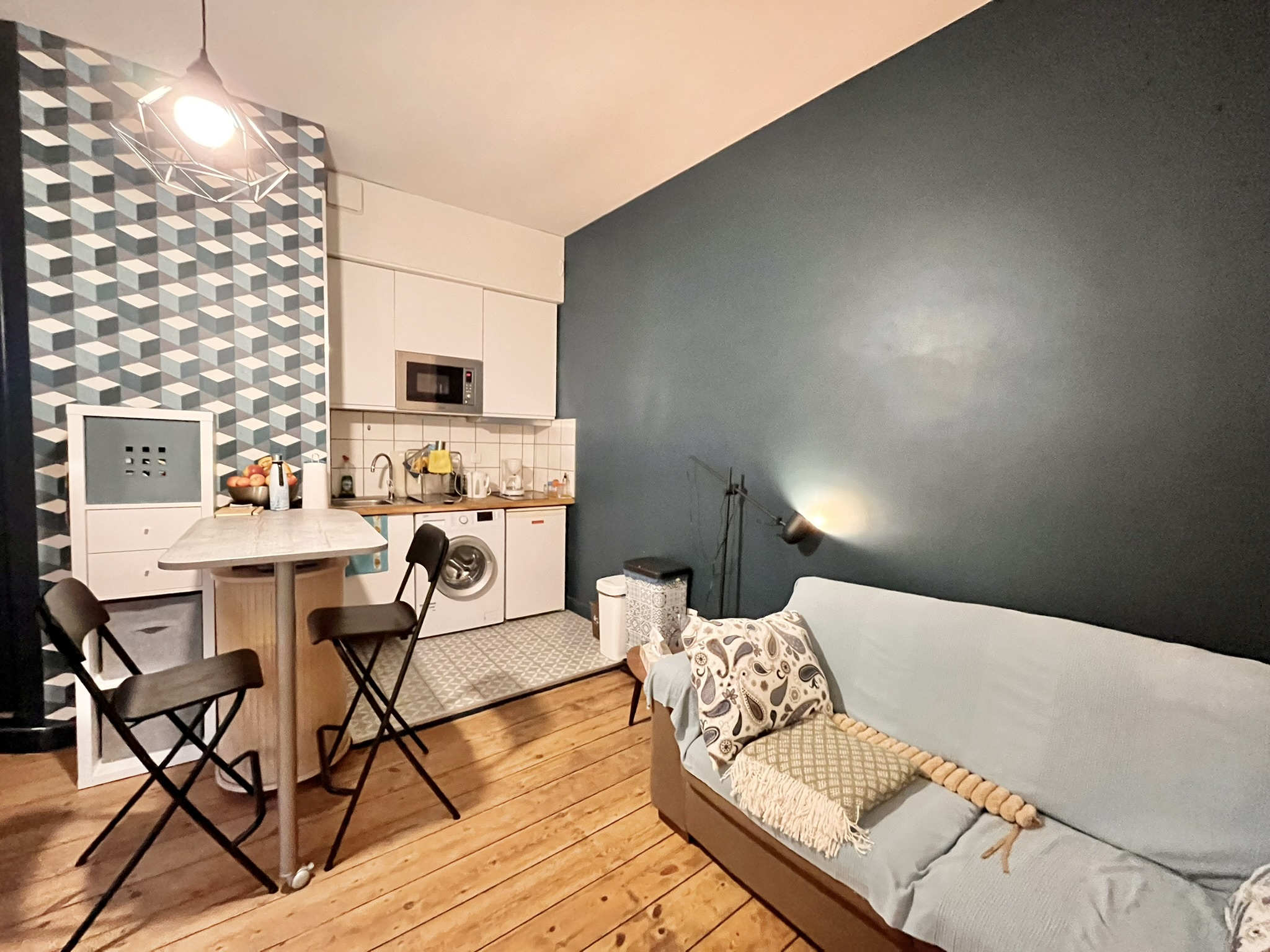 L’appartement se compose d’une entrée, d’une salle d’eau, d’un WC séparé, d’une grande pièce de vie avec cuisine aménagée et d’une chambre.