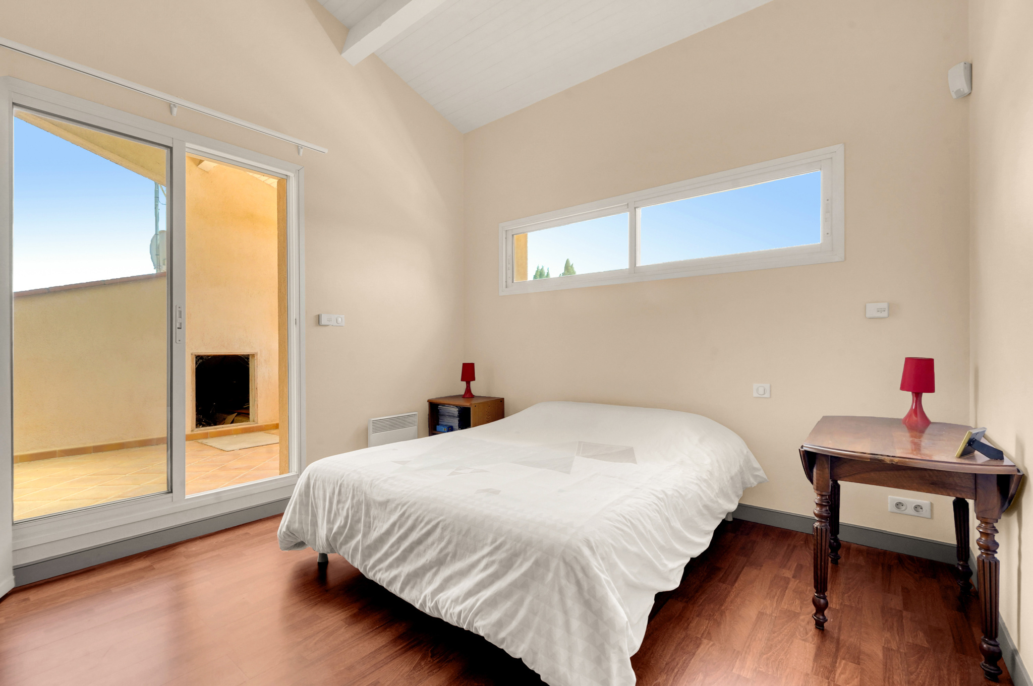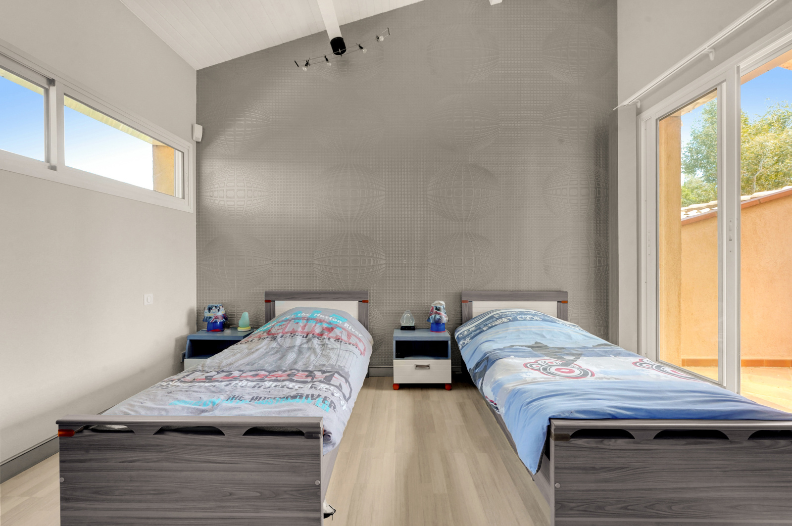 A l'étage, nous trouvons deux autres chambres, elles aussi équipées de salles d’eau privatives, ainsi que des sanitaires séparés. Ces chambres, destinées aux enfants, donnent accés à un terrasse avec vue sur la piscine.