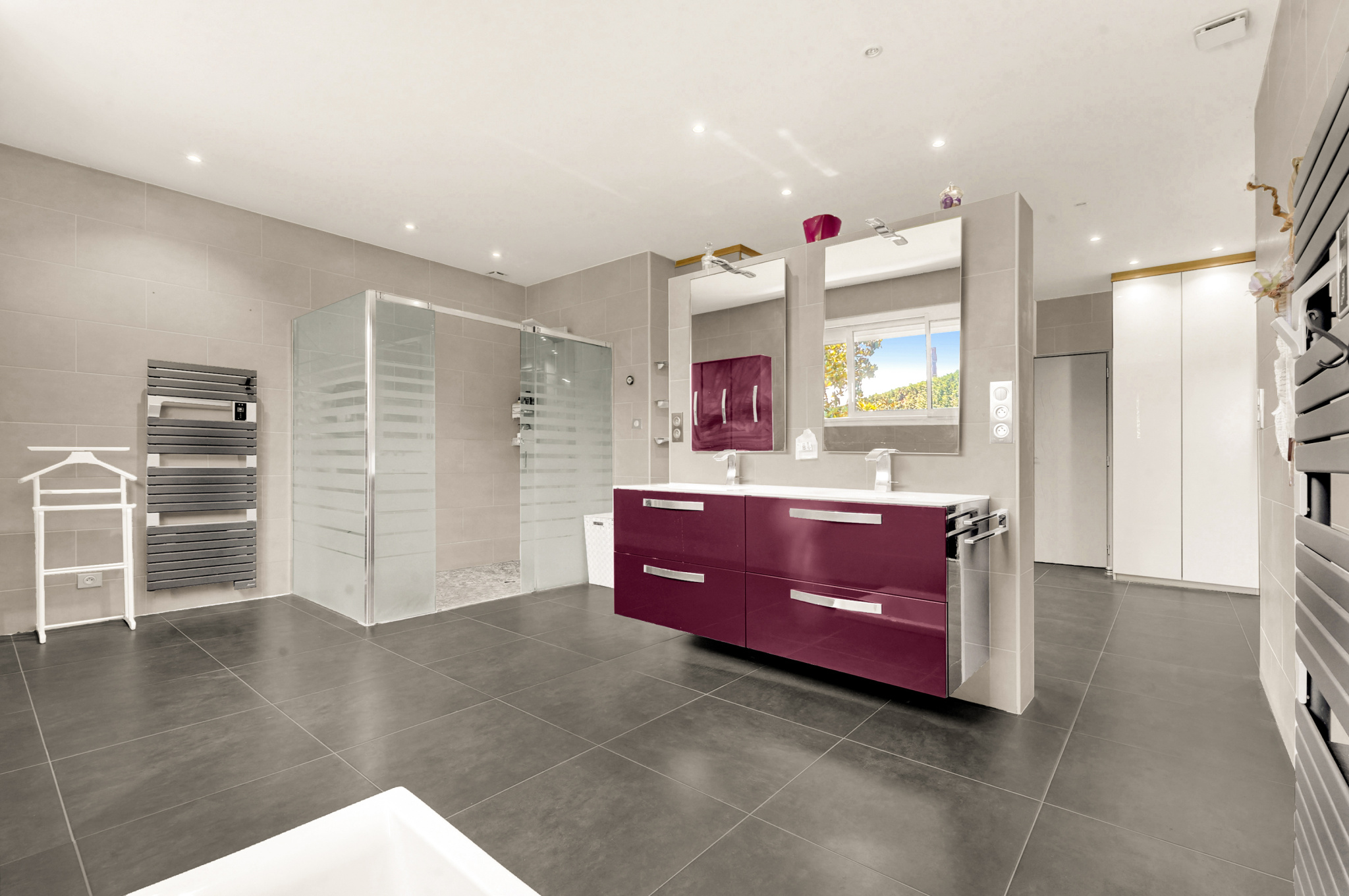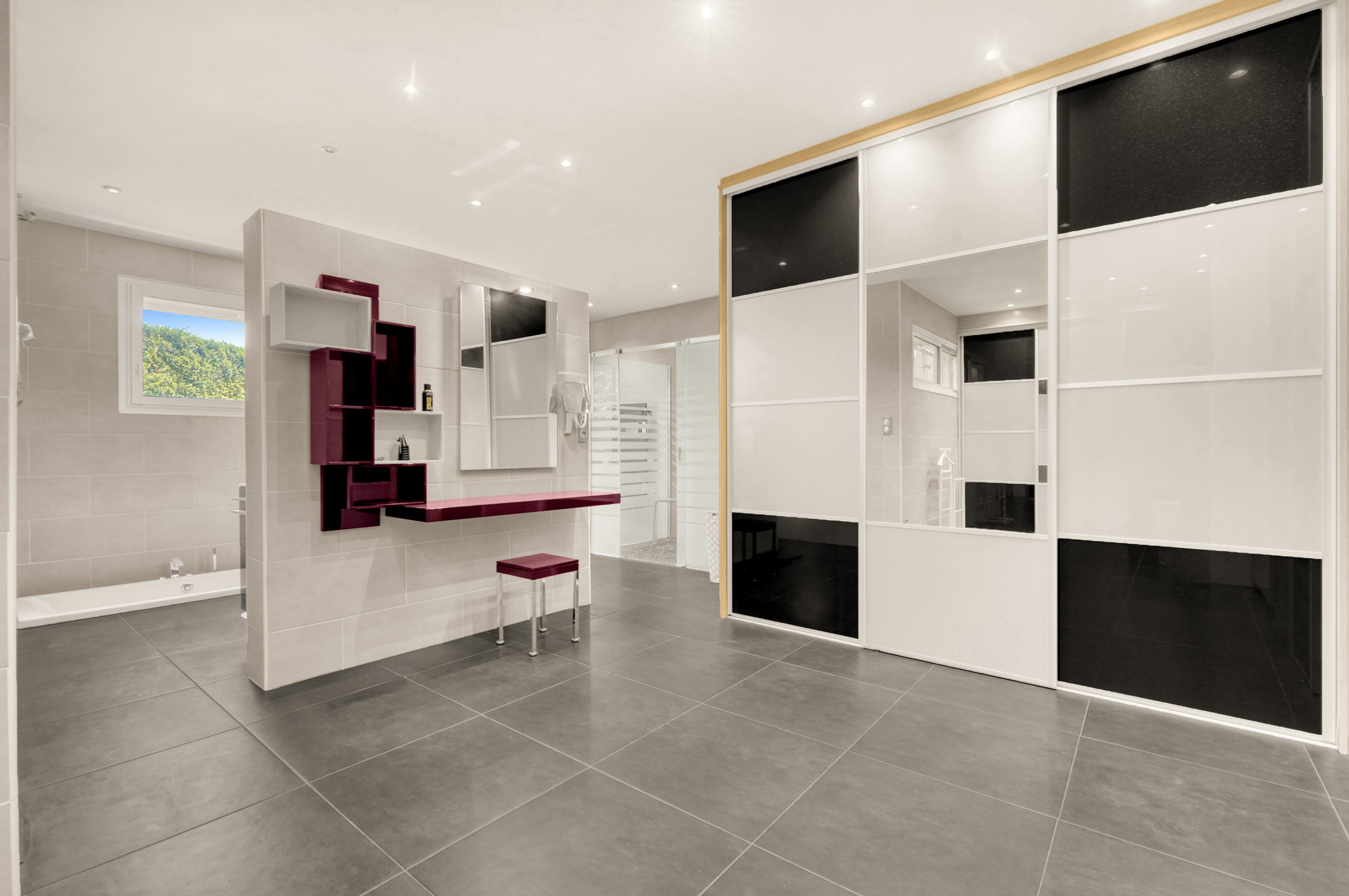Au rez-de-chaussée, une chambre d'ami avec salle d'eau privative, et la "master suite" de 56 m² composé de la chambre, d'un dressing sur-mesure et une grande salle de bains avec douche et baignoire. Cette suite parentale est prolongé par un espace SPA donnant sur le jardin et entièrement vitré.