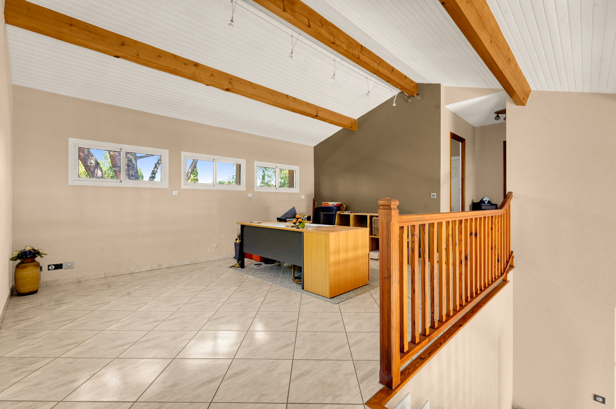 Le cœur de la maison s’organise autour d’une cuisine indépendante, entièrement équipée. Cette pièce bénéficie d’un accès direct à une vaste terrasse de plus de 50 m², idéale pour les repas en extérieur. Le séjour, lumineux et spacieux, se compose d’un double salon et d’un volume cathédrale déplafonné de 77 m². Une rochelle surplombant le salon offre un espace parfait pour un bureau ou une salle de jeux.