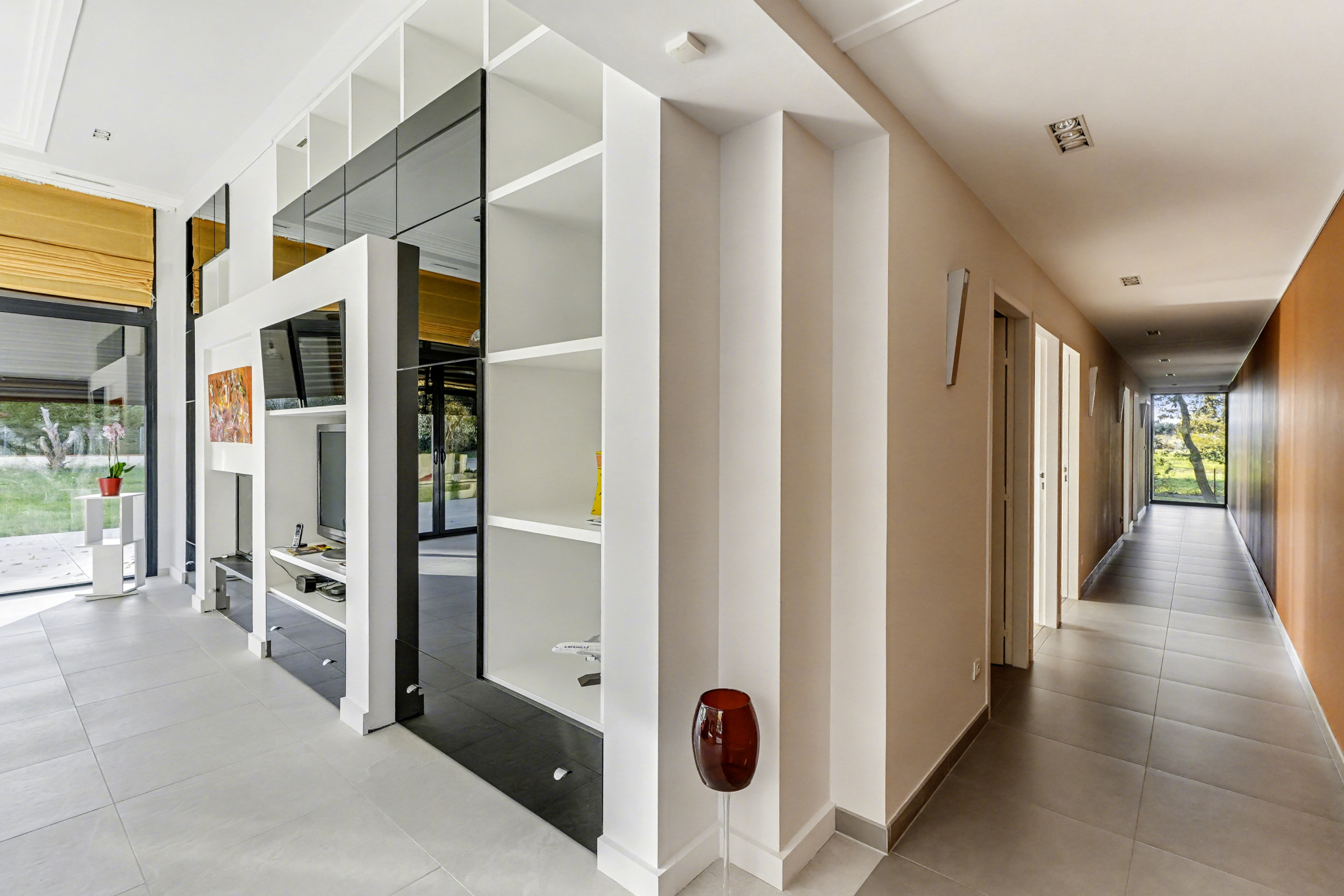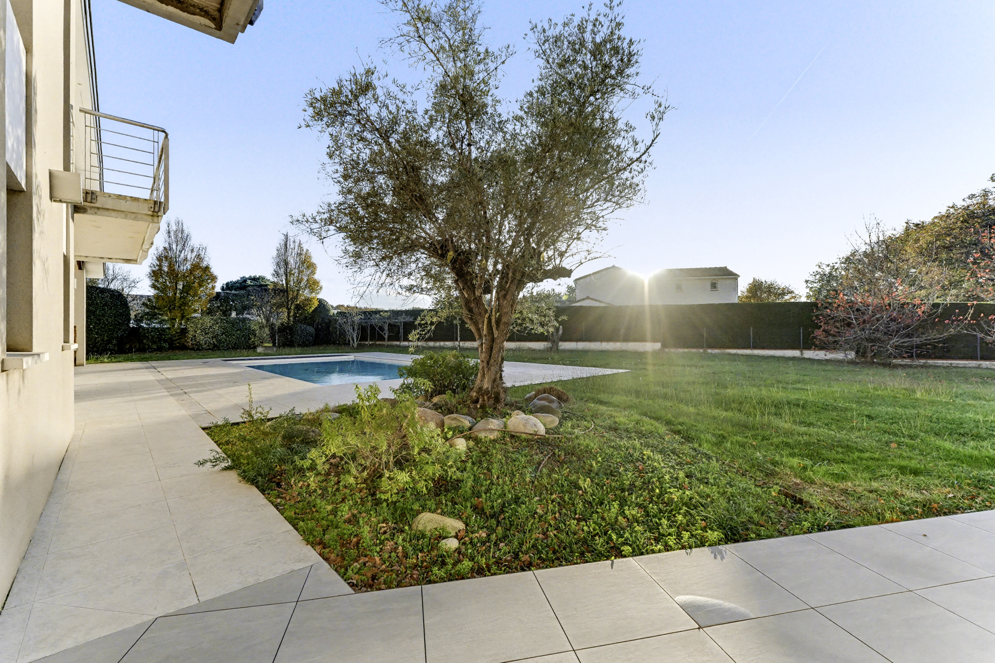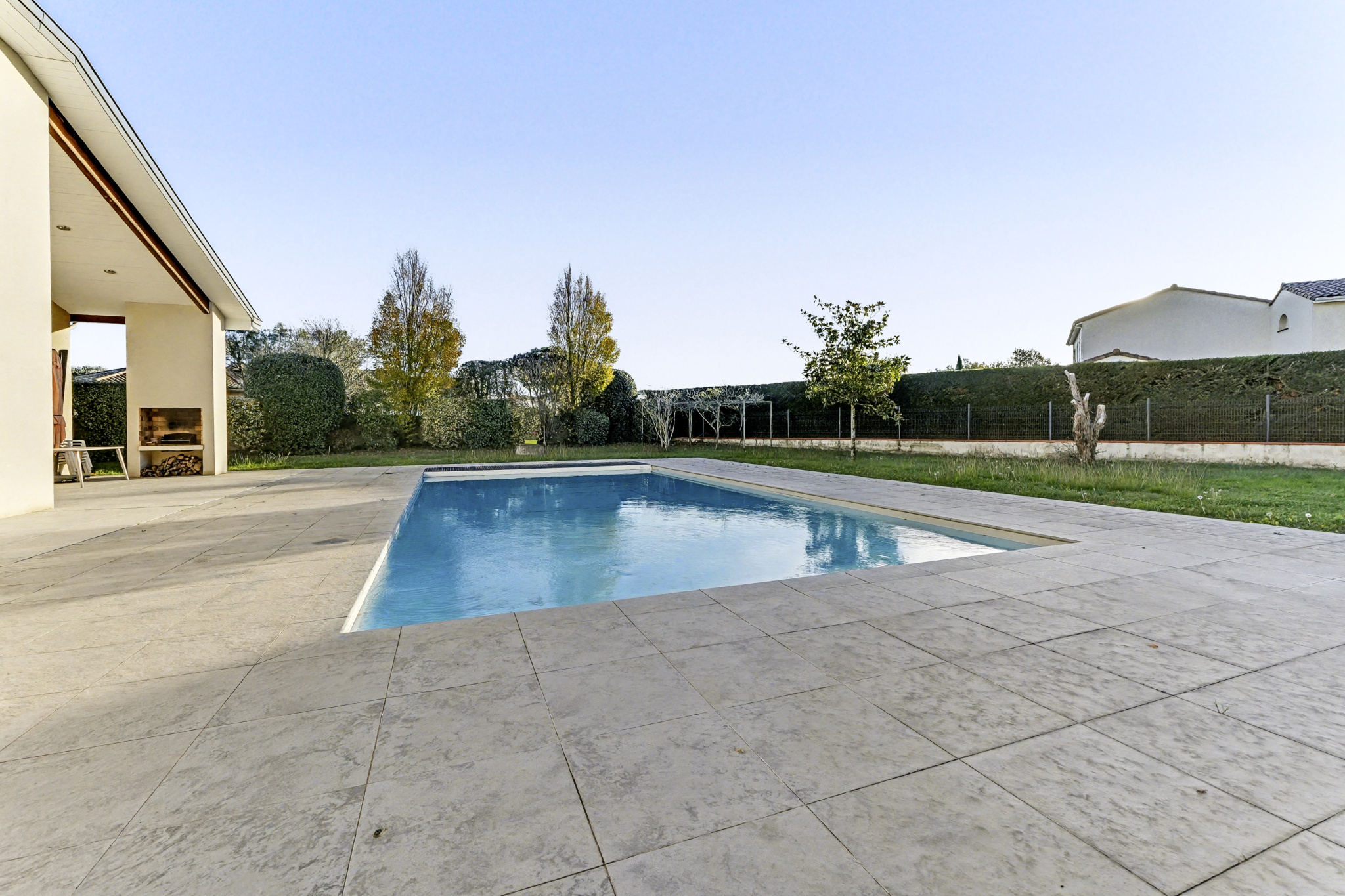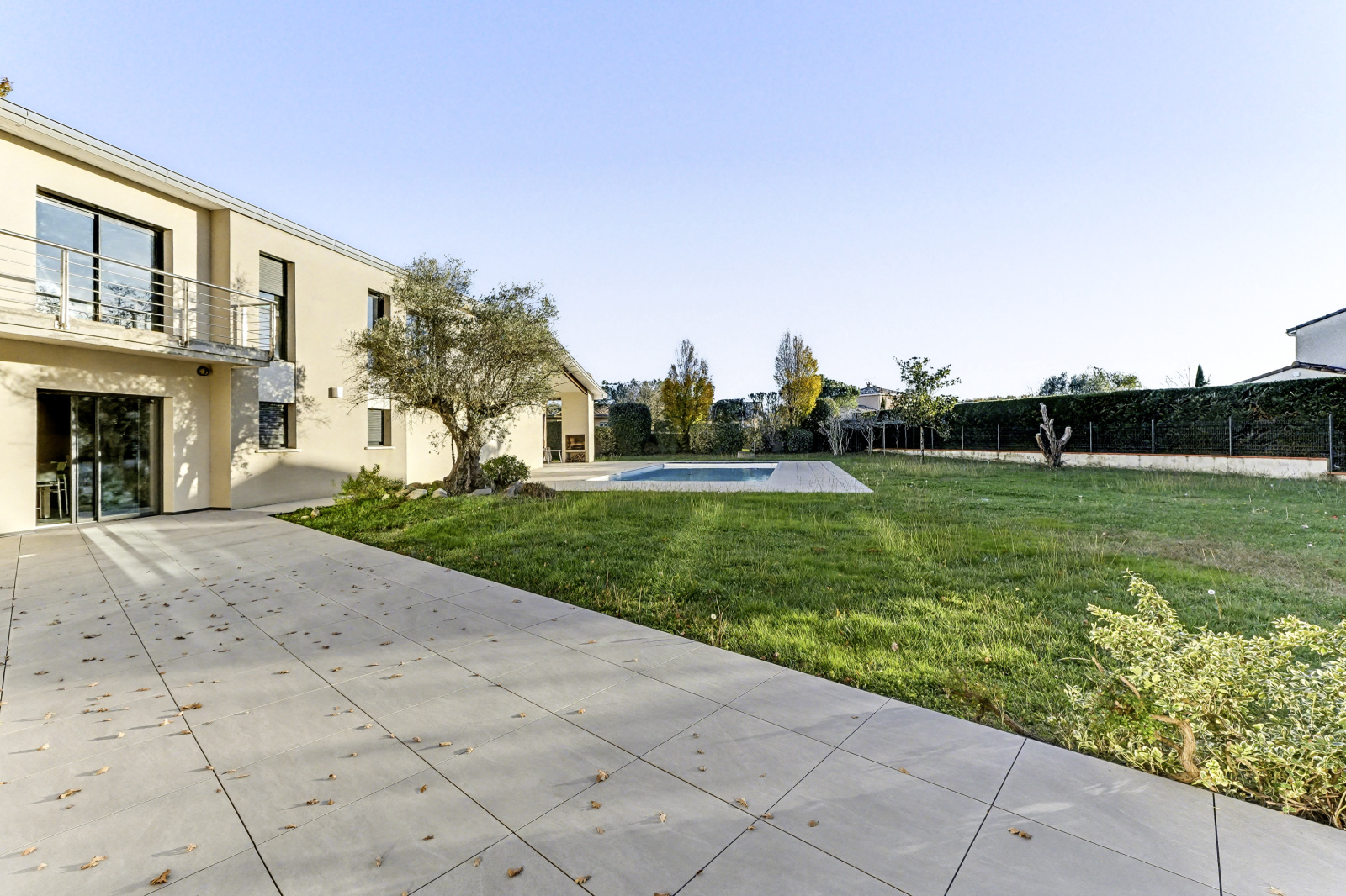 Les extérieurs prolongent l’architecture : larges terrasses plein sud, piscine intégrée, pool house et jardin arboré créent un ensemble harmonieux et propice à la détente.