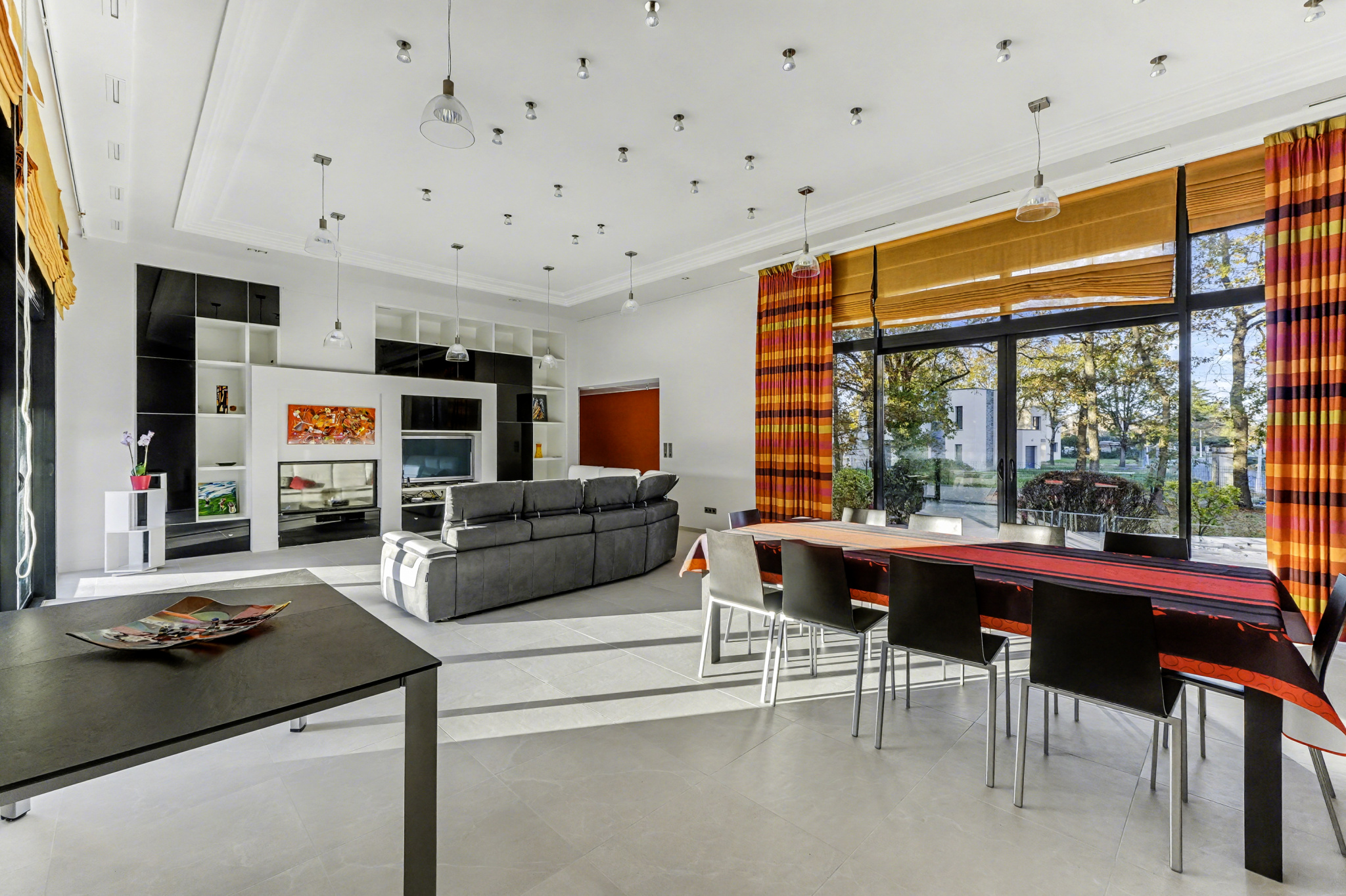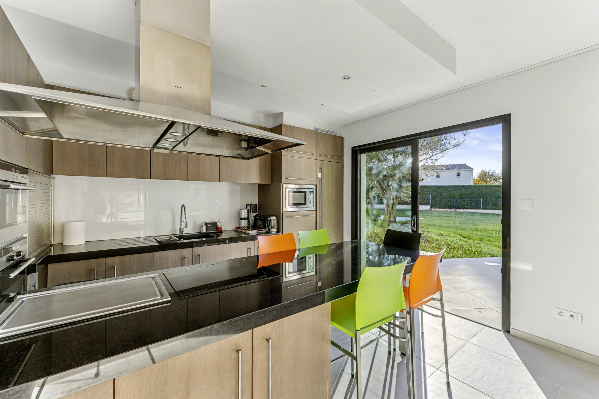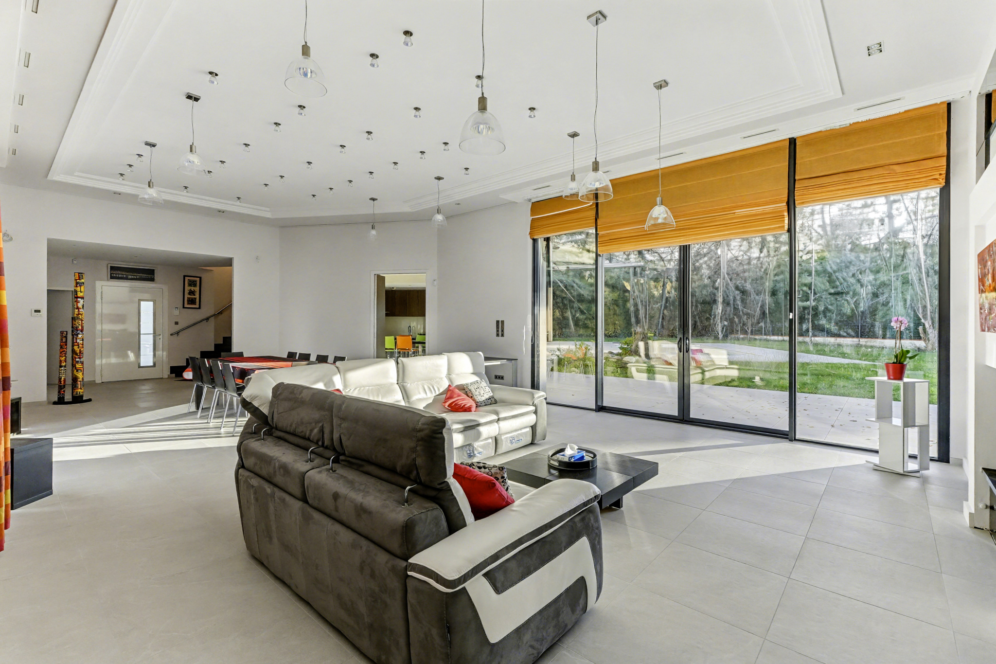 Le séjour traversant, doté d’une belle hauteur sous plafond, offre une luminosité exceptionnelle grâce à de larges baies vitrées ouvertes sur les terrasses et la piscine. La cuisine, élégante et parfaitement équipée, accompagne naturellement la vie familiale et les moments de réception.