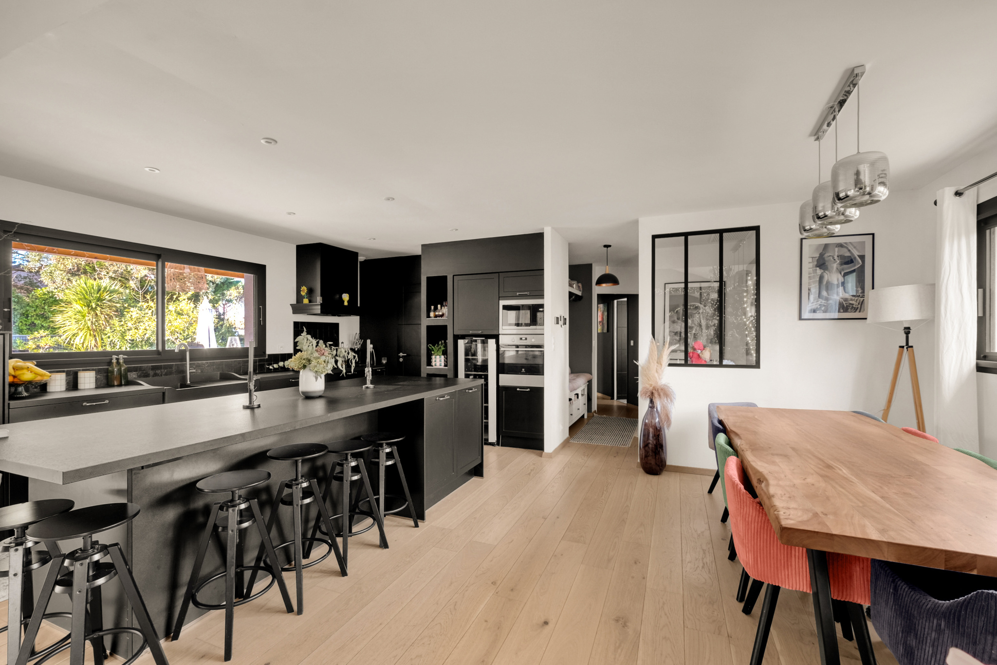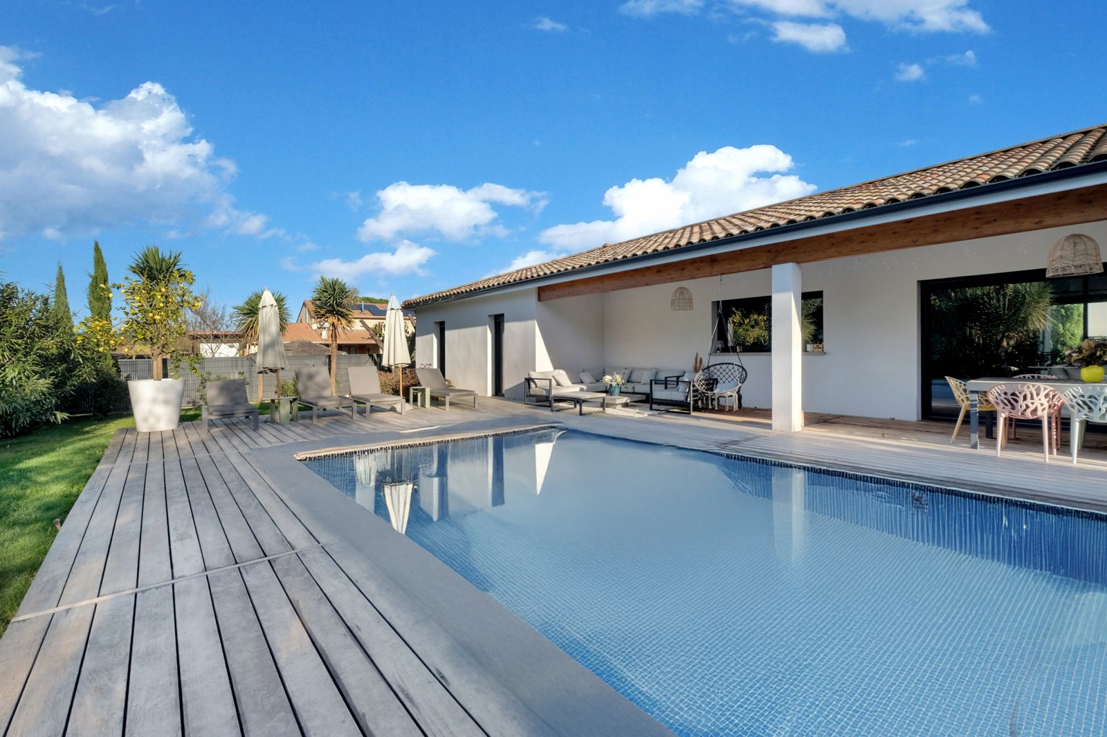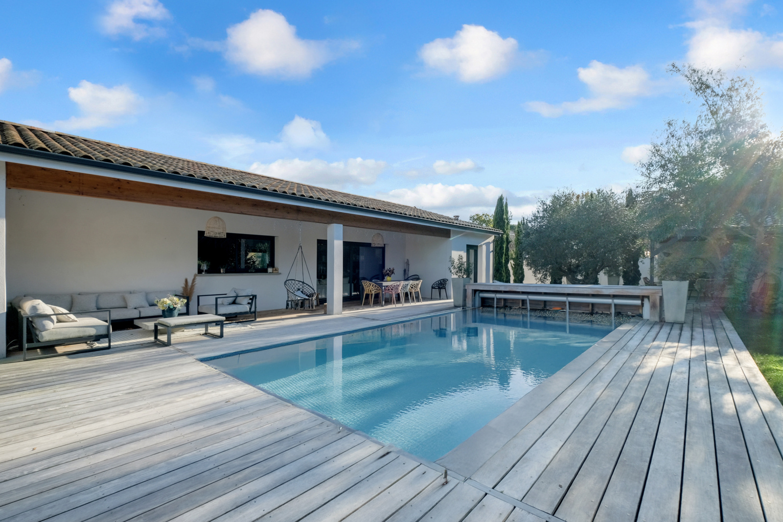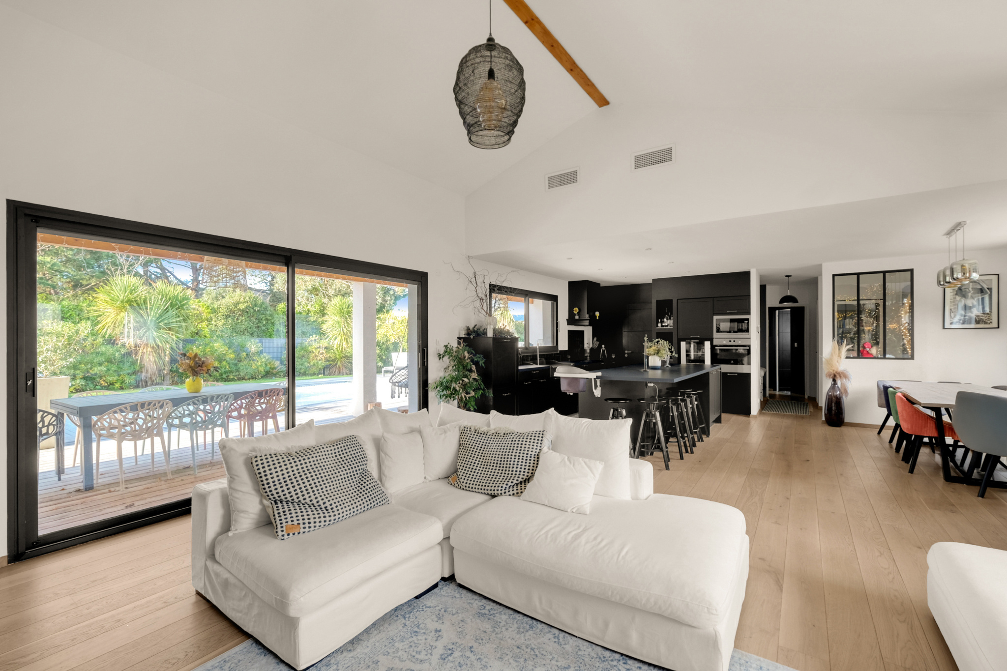 La pièce de vie impressionne par son déplafonnement, son volume et sa lumière : un séjour sublimé par une cheminée électrique d’agrément, ouvert sur une cuisine haut de gamme entièrement équipée, avec de larges menuiseries Technal aluminium qui prolongent l’espace vers la terrasse en bois IP. L’ensemble s’ouvre sur la piscine et le jardin parfaitement exposé.