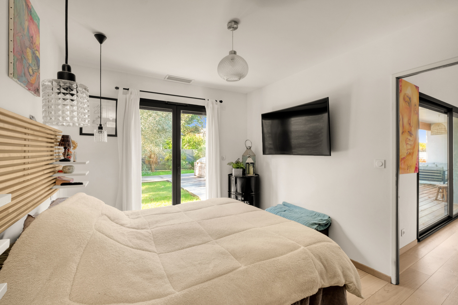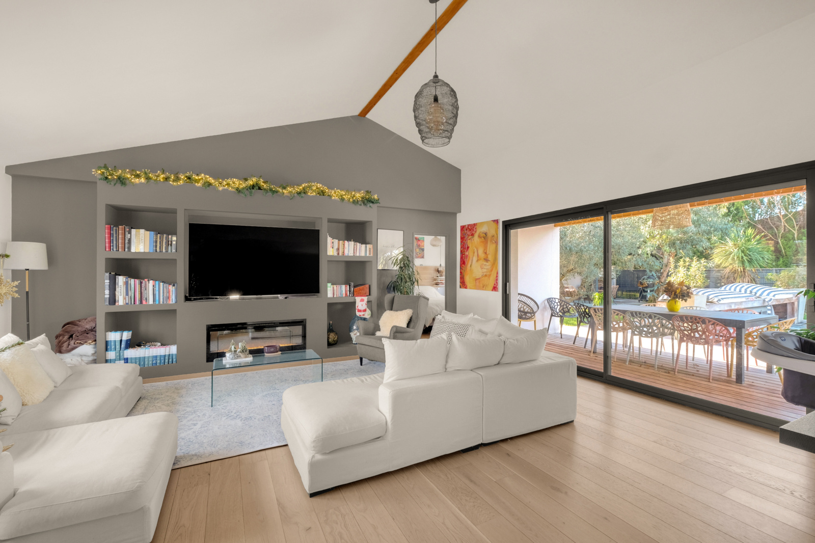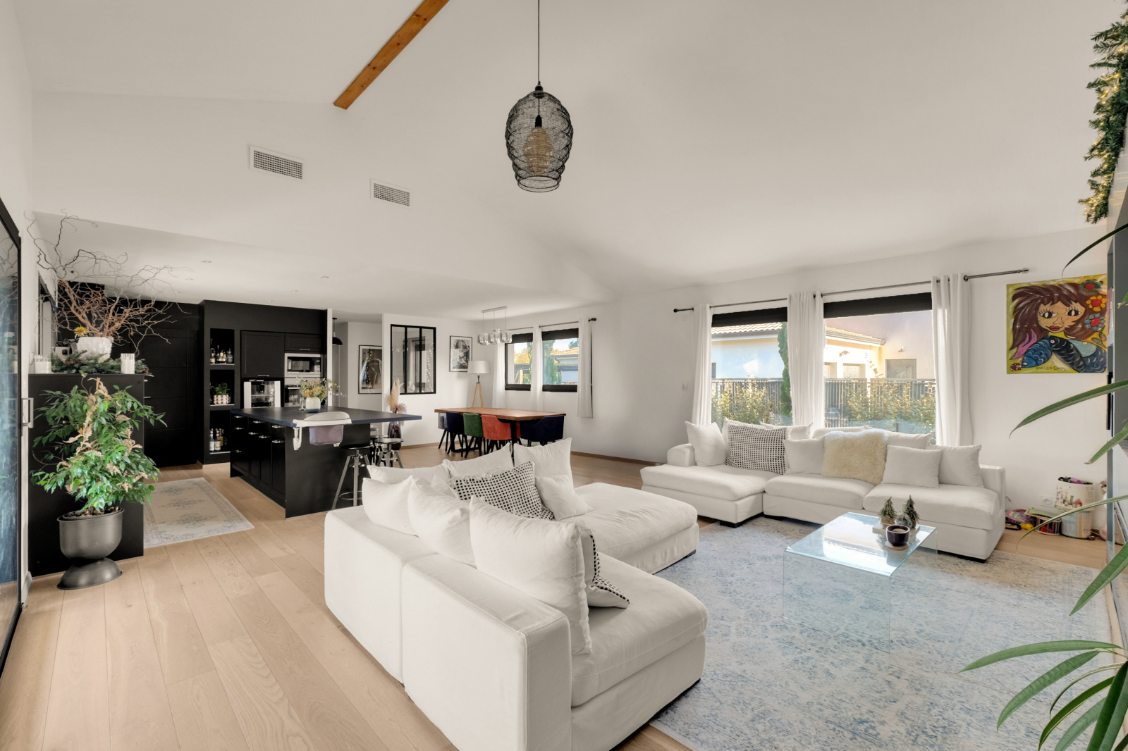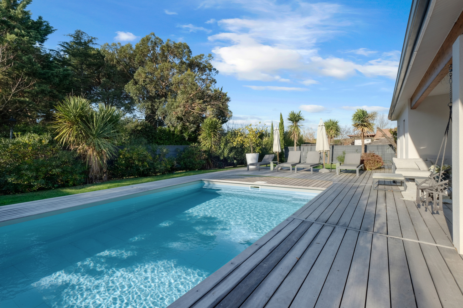 La pièce de vie impressionne par son déplafonnement, son volume et sa lumière : un séjour sublimé par une cheminée électrique d’agrément, ouvert sur une cuisine haut de gamme entièrement équipée, avec de larges menuiseries Technal aluminium qui prolongent l’espace vers la terrasse en bois IP. L’ensemble s’ouvre sur la piscine et le jardin parfaitement exposé.