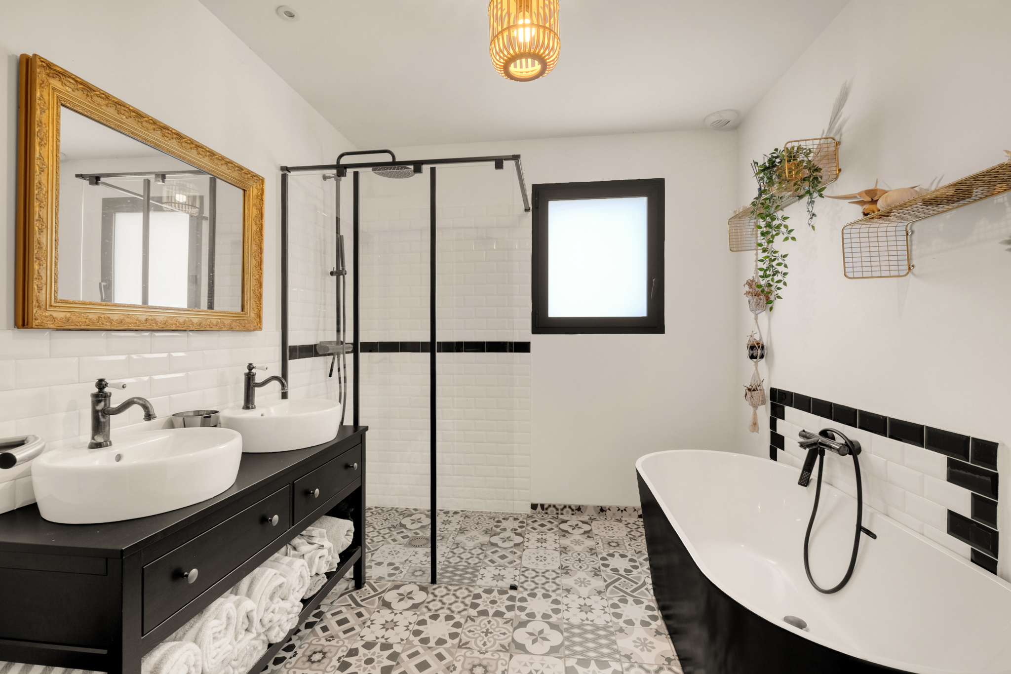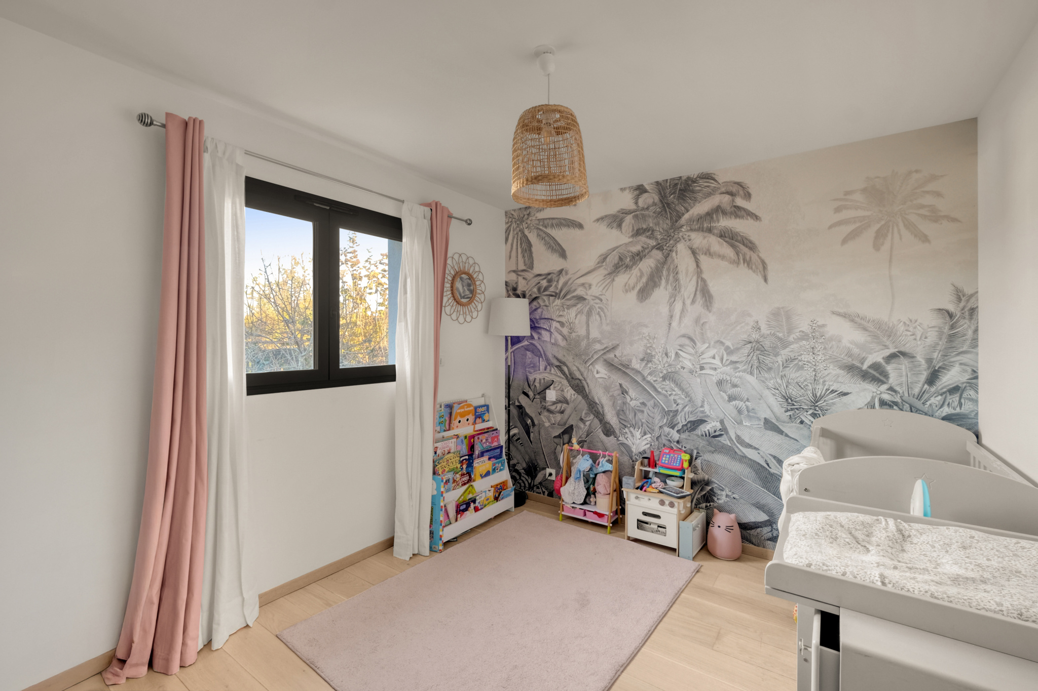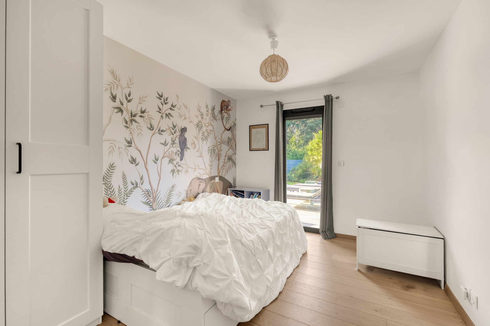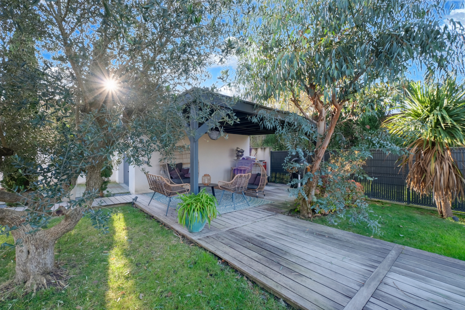 La pièce de vie impressionne par son déplafonnement, son volume et sa lumière : un séjour sublimé par une cheminée électrique d’agrément, ouvert sur une cuisine haut de gamme entièrement équipée, avec de larges menuiseries Technal aluminium qui prolongent l’espace vers la terrasse en bois IP. L’ensemble s’ouvre sur la piscine et le jardin parfaitement exposé.