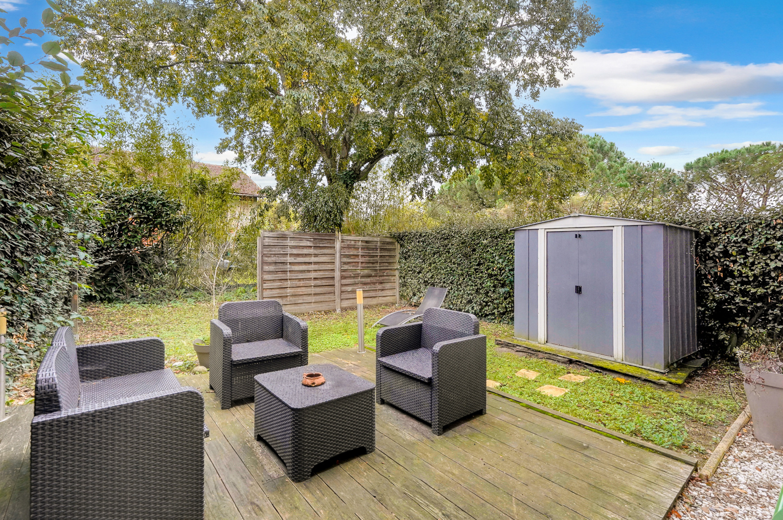 Le jardin, orienté est, offre un véritable espace de détente et peut être clôturé. Un cabanon vient compléter l’ensemble.
