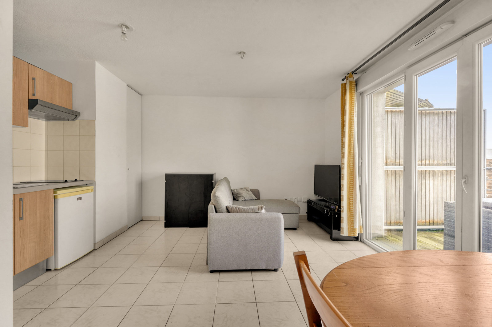 Il se compose d’une entrée avec placards, d’une salle de bains avec WC, d’une grande chambre ainsi que d’un séjour lumineux avec cuisine ouverte donnant accès à un balcon d’environ 6,40 m².