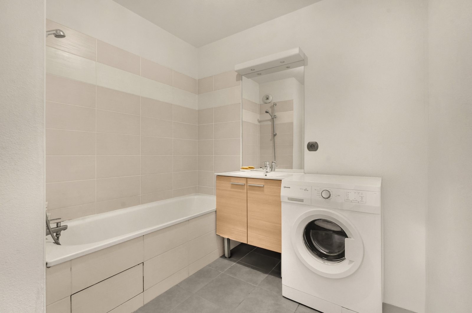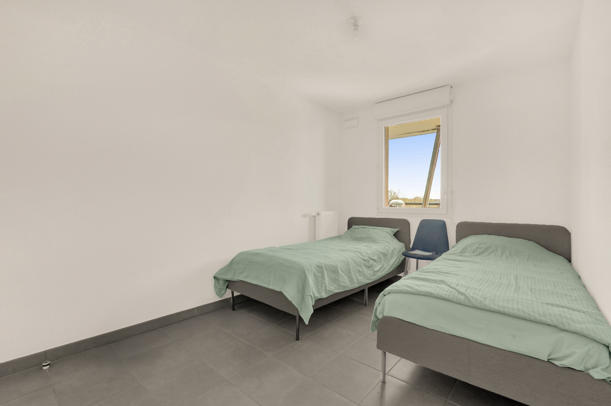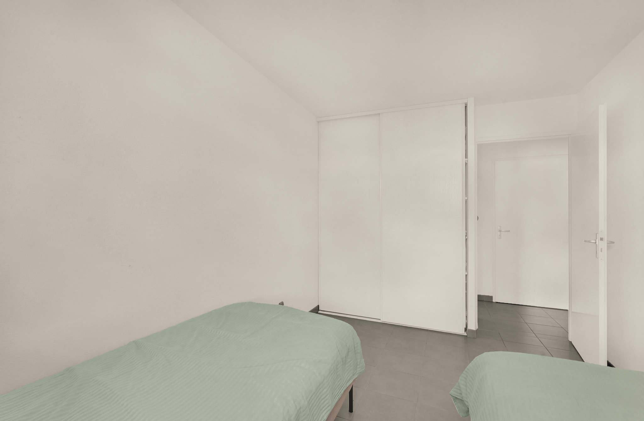 L'appartement dispose également de deux grandes chambres avec placards intégrés, offrant un espace de rangement optimal. Vous trouverez également une salle de bains moderne et des WC séparés pour plus de confort.