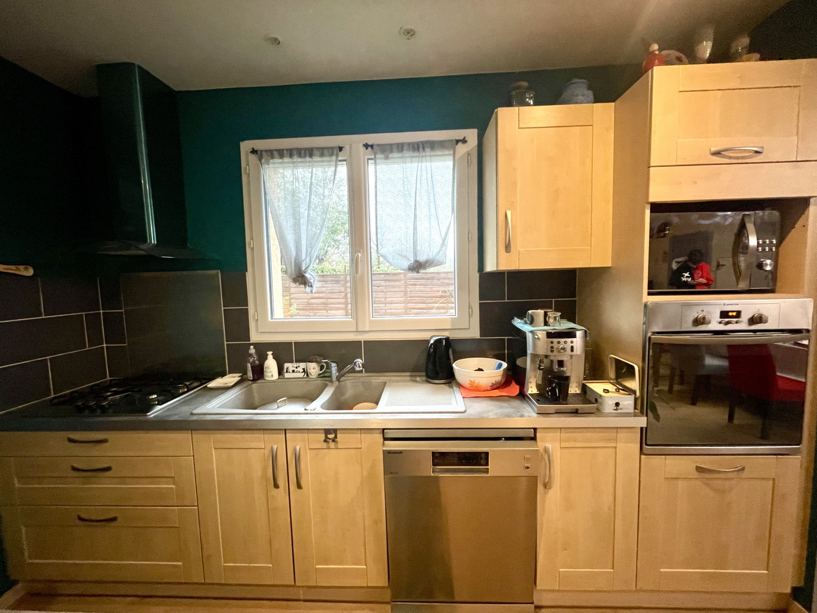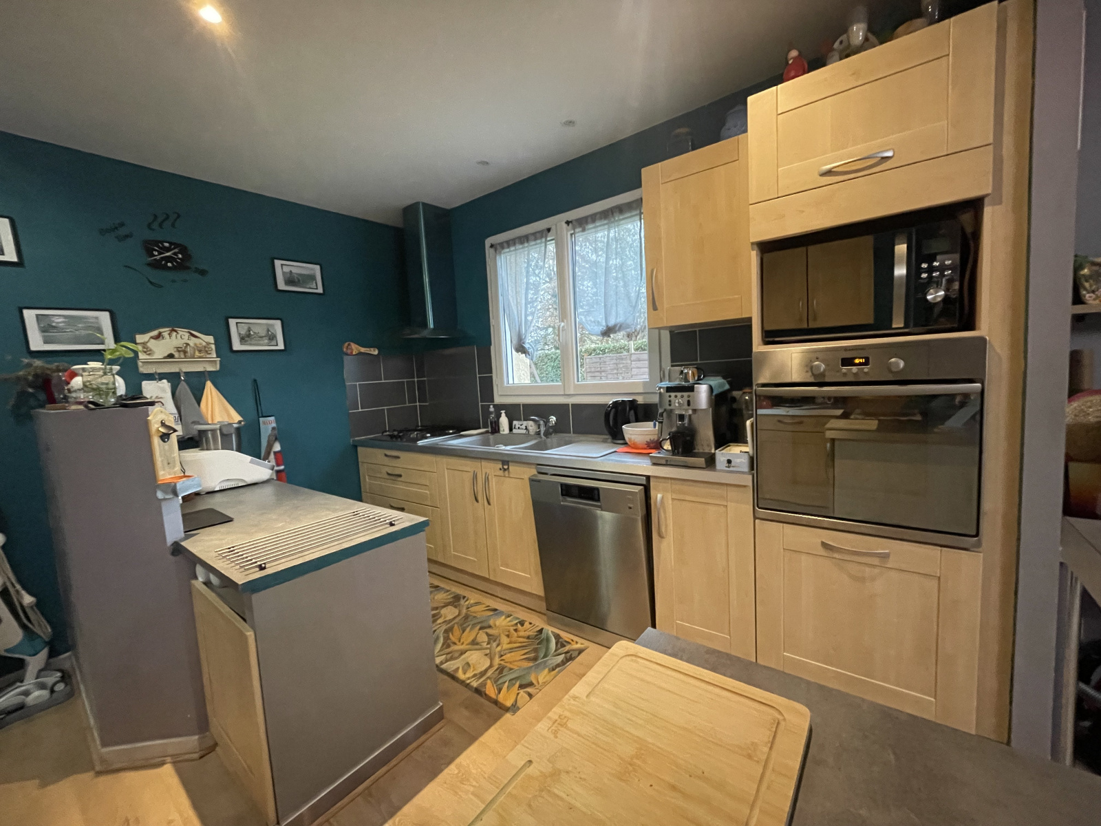 La cuisine ouverte, entièrement équipée, s’intègre parfaitement à l’espace de vie et dispose d’une buanderie à proximité, apportant un réel confort de rangement.